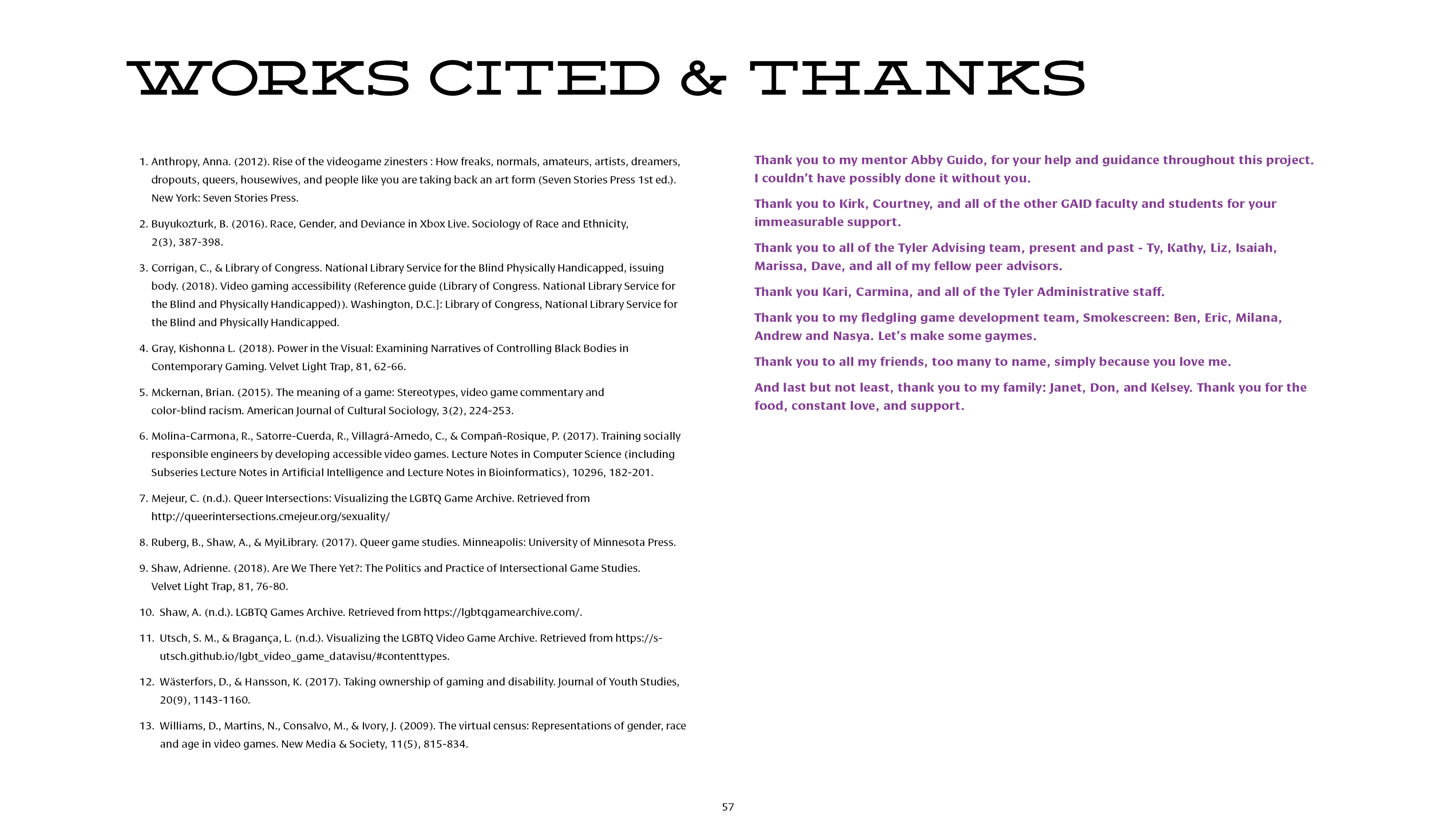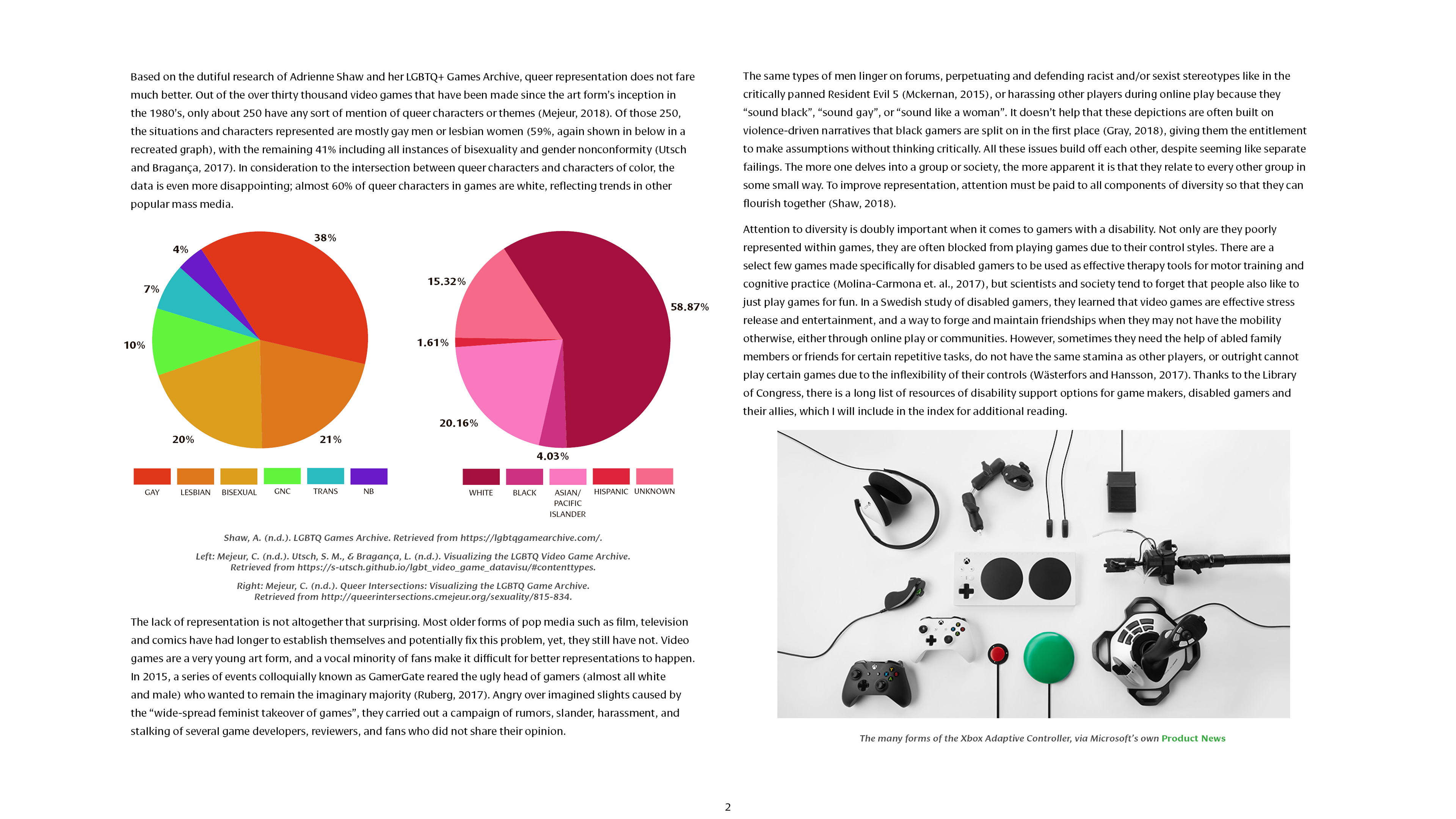 Thanks to a grant awarded to me by Temple University, I was given the opportunity to research the state of diversity via character representation and disability access in video games. Using the research material, I was able to lay the groundwork for a game of my own design that had the representation that was sorely lacking. I plan on continuing to work on this project until I eventually have the ability to publish it.